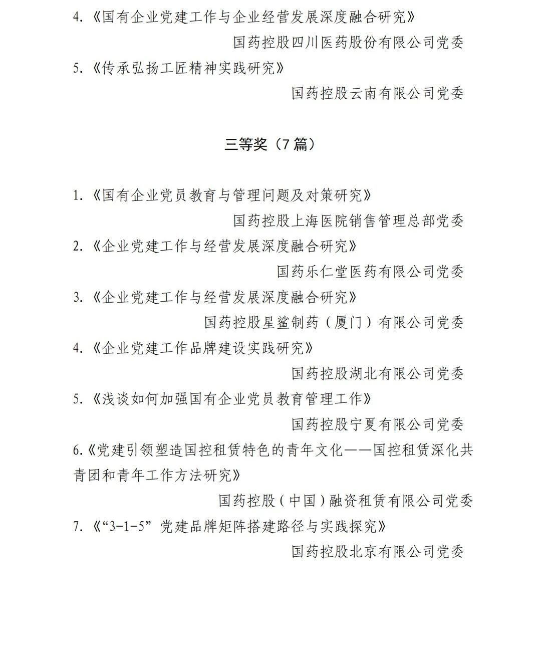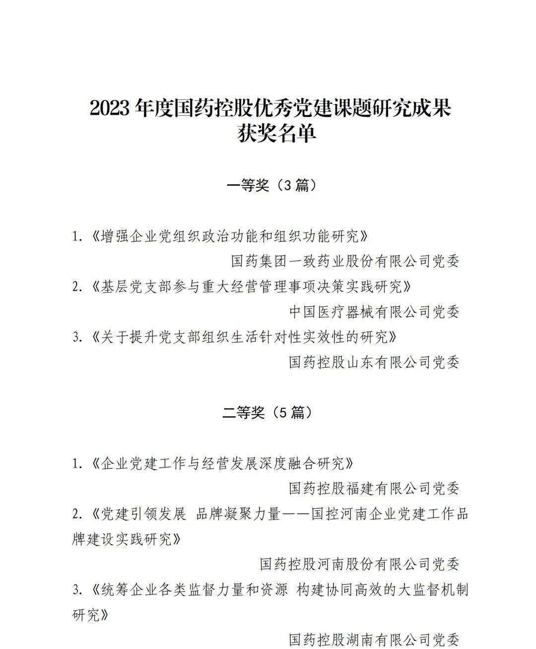 2023年,国药控股党委坚持以习近平新时代中国特色社会主义思想为指导,紧密结合企业中心工作,围绕混合所有制企业党建和思想政治工作,聚焦企业发展实际,继续在全系统组织开展党建课题研究工作,形成了一批有深度、有创见、有价值的研究成果。经课题中期检查、结题专家评审,国药控股党建理论研究小组审定,共评选出一等奖优秀成果3篇,二等奖优秀成果5篇,三等奖优秀成果7篇,予以表彰。