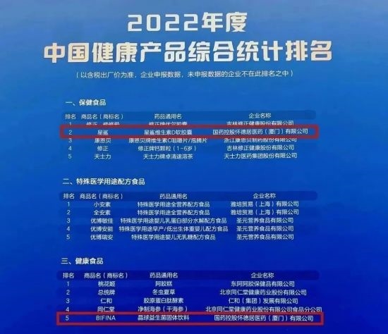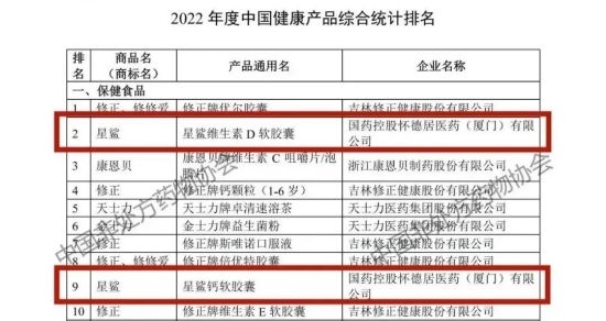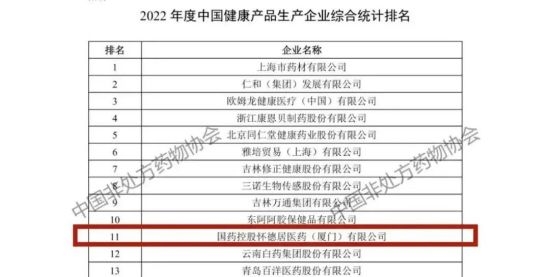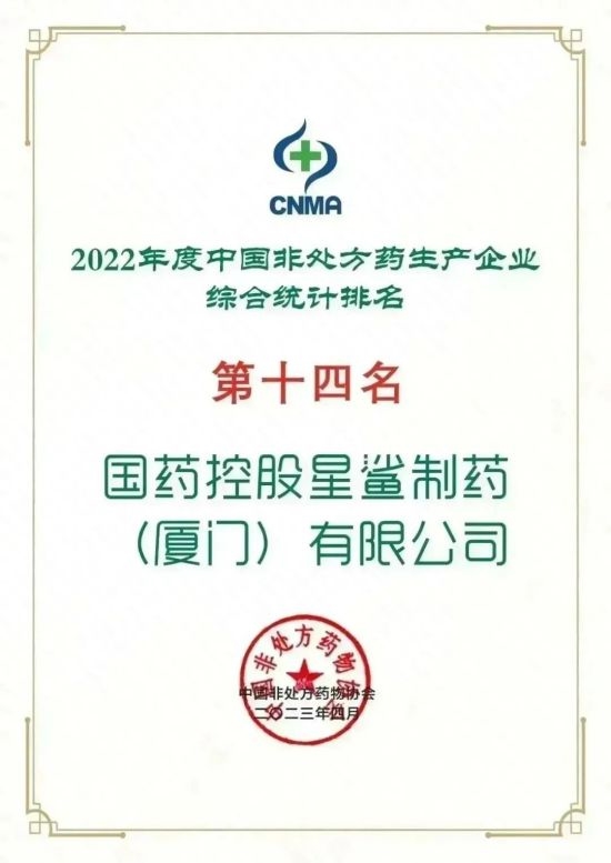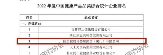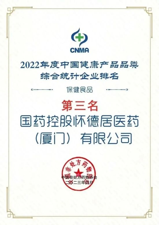 凭借优异的市场表现与品牌影响力,国控星鲨荣膺“2022年度中国非处方药生产企业综合统计排名”第14名,旗下国药控股怀德居医药(厦门)有限公司(以下简称“国控怀德居”)荣膺“2022年度中国健康产品生产企业综合统计排名”第11名、“2022年度中国健康产品品类综合统计企业排名保健食品类”第3名。