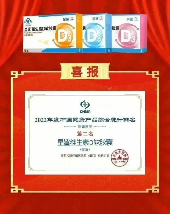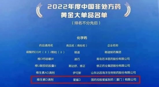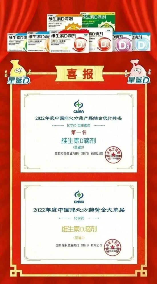 第二届中国OTC大会日前在乌镇举行。作为家喻户晓的维生素D品牌,国药控股星鲨制药(厦门)有限公司(以下简称“国控星鲨”)的明星产品星鲨D®维生素D滴剂在此次大会上斩获“2022年度中国非处方药产品综合统计排名化学药•维生素类”第一名和“2022年度中国非处方药黄金大单品”两项荣誉。同时,星鲨®维生素D胶囊和星鲨®钙软胶囊分别斩获“2022年度中国健康产品综合统计排名保健食品类”第2名和第9名。Bifina晶球益生菌固体饮料夺得“健康食品类”第5名。