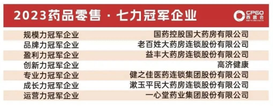 国大药房秉承“健康所需,尽在国大”的品牌定位不断夯实经营能力,入选代表药品零售企业综合实力的“西普金奖·2023年药品零售综合竞争力百强榜”,名列前三。与此同时,在规模力方面,国大药房荣获“2023年药品零售综合竞争力·规模力标杆企业”。