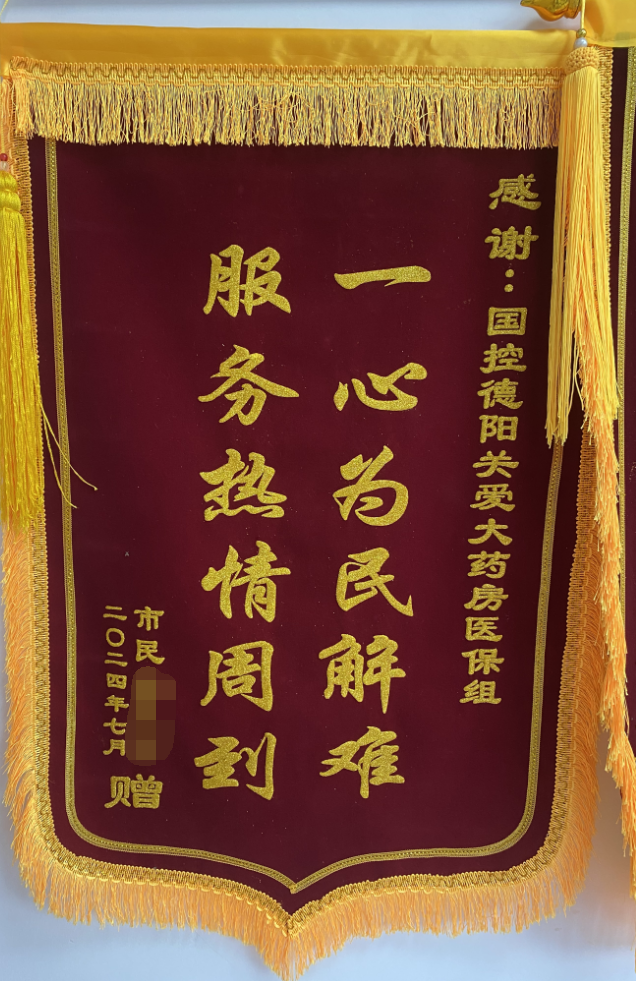 在四川德阳,国药四川建立起医保服务站,2023年8月正式授牌启动,为市民提供医保政策咨询、特药认定报销资料协助、门诊费用资料补报,以及医保电子凭证申领等服务。自医保服务站建立来,当地百姓都感慨少跑许多冤枉路,办理资料也快捷便利了,遇到相关医保报销问题时,也能快速找到咨询地点,还能及时有效了解医保相关政策,更有患者及家属特地送来锦旗以表感谢。