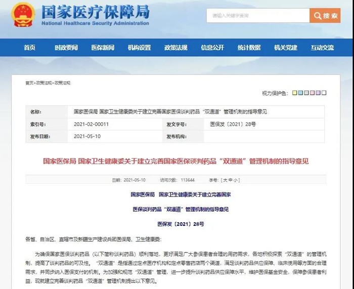 2021年5月,国家医保局、国家卫健委联合出台《关于建立完善国家医保谈判药品“双通道”管理机制的指导意见》,定义“双通道”是指通过定点医疗机构和定点零售药店两个渠道,满足医保谈判药品供应保障、临床使用等方面的合理需求,并同步纳入医保支付的机制。首次从国家层面将定点零售药店纳入医保药品的供应保障范围,实行与医疗机构统一的支付政策。