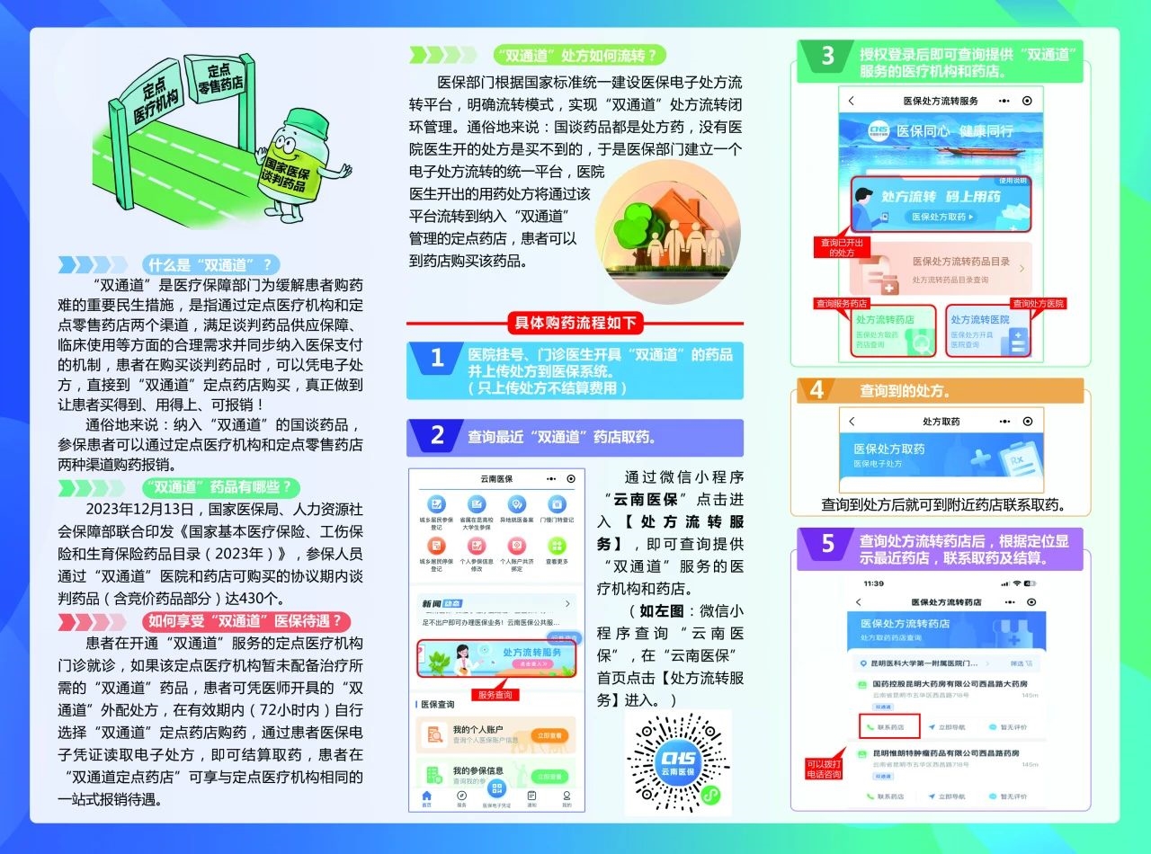 “双通道”药店好比是医院的“扩容药房”,患者到医疗机构就诊,医生根据病情开具处方,患者通过自愿原则,若选择“双通道”电子处方流转至定点药店取药,医院将开具电子处方并传至“处方流转平台”。患者可以任选就近的、有货的“双通道”定点药店,出示患者医保卡或者电子医保凭证即可获取患者处方信息,通过药店执业药师审核后,就可以在药店报销拿药。